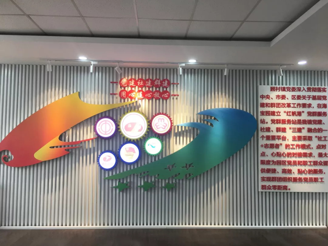 如上图我们给顾村镇海宝园做的党群服务站,在党的引导下,助推企业健康发展。党群服务站是党建、社建、群建的重要平台,团结联合工会、妇联、共青团等群团组织,形成服务党员、服务职工、服务群众的联盟战线,坚持以需求为导向,本着为人民服务的宗旨,为园区“两新”企业和园区职工提供全方位的精准化服务。